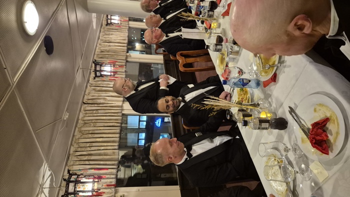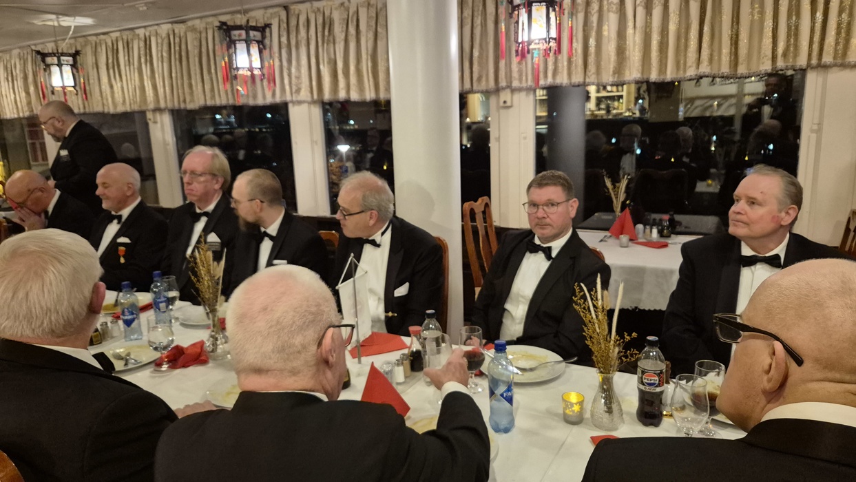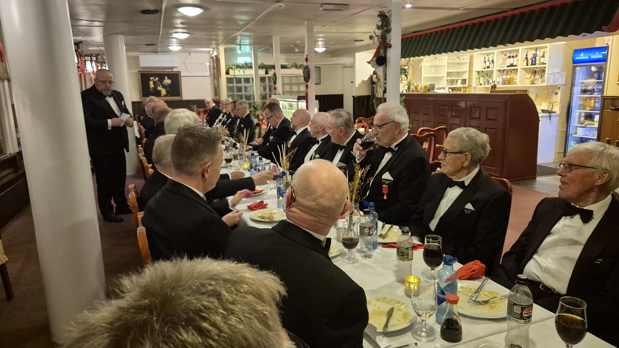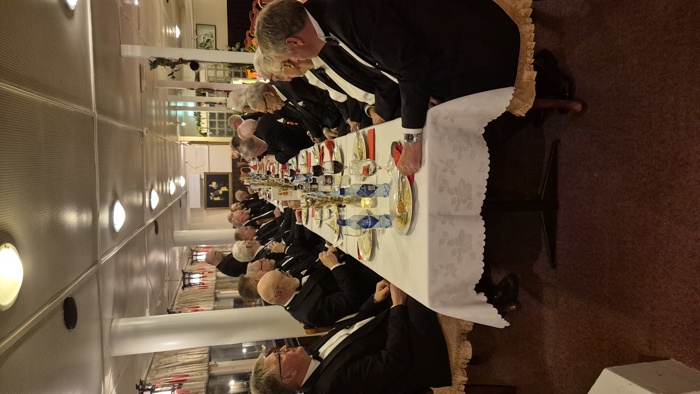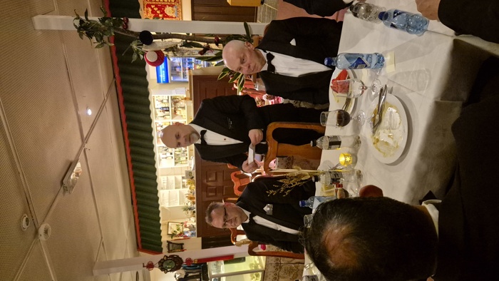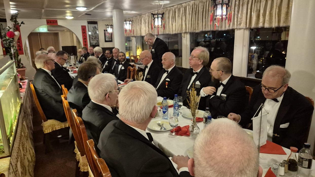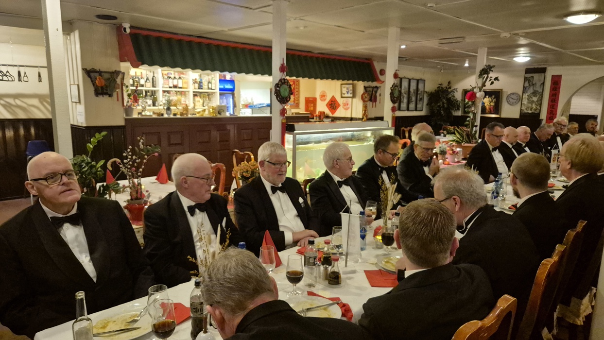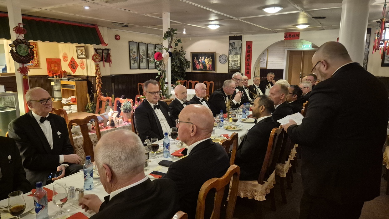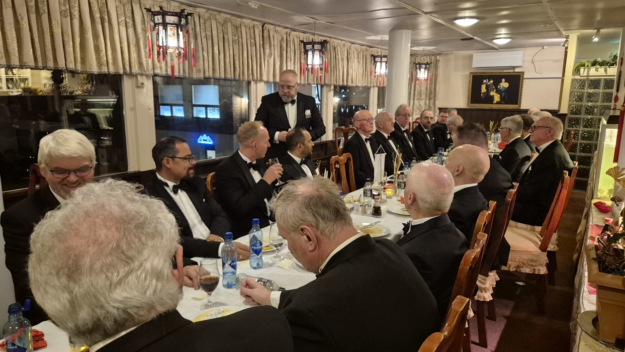 selv også var litt overveldet over denne kveldens hendelser. Etter det rituelle møtet samlet vi oss i restauranten og spiste et bedre brodermåltid. Under det hyggelige måltidet fortsatte samtalene mellom brødrene, og også her var det taler og gratulasjoner til vår nye broder.